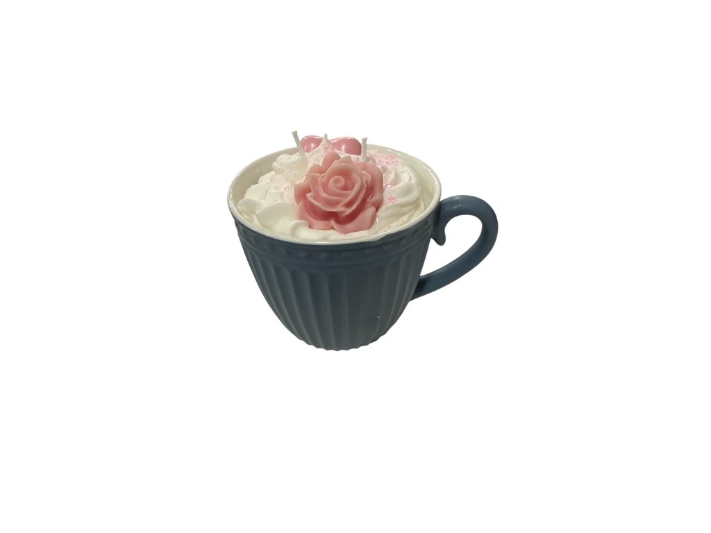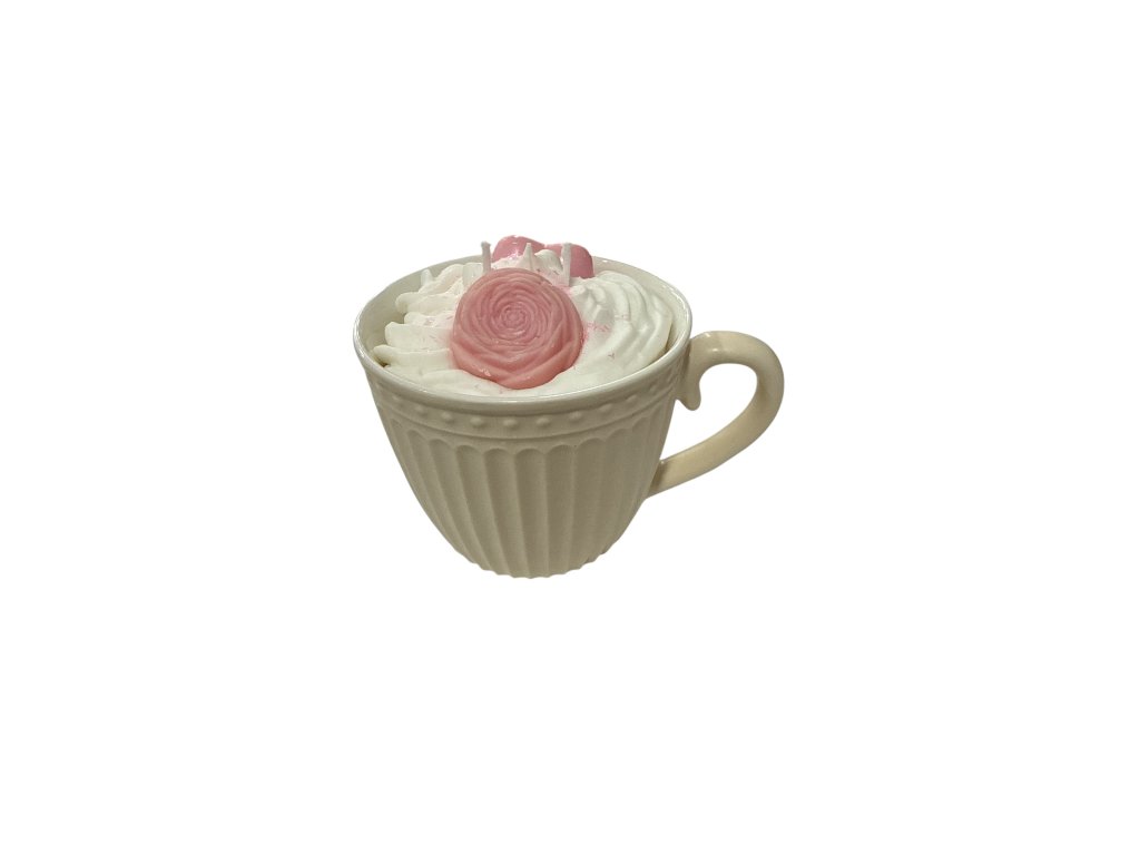 -krásná svíčka v keramickém hrnečku s rýhováním, ozdobená kytičkou a srdíčkem s jemnou vůní
